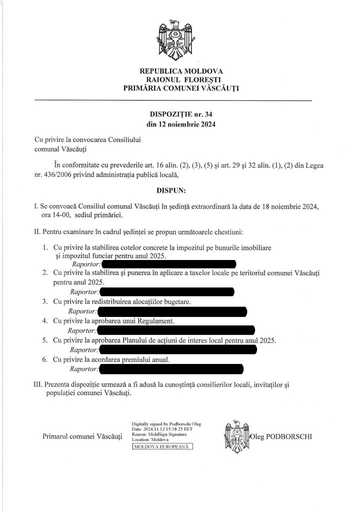 Convocarea Consiliului comunal Văscăuți